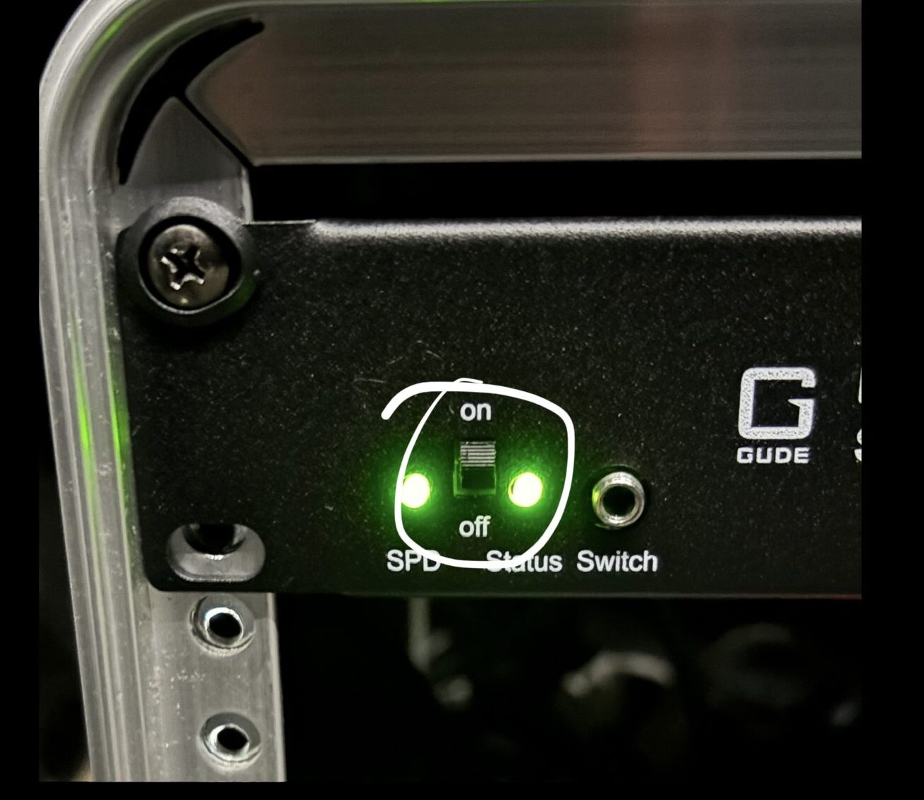 - Přepínač ON/OFF: Umístěn pod stolem s DJ technikou vedle diody.